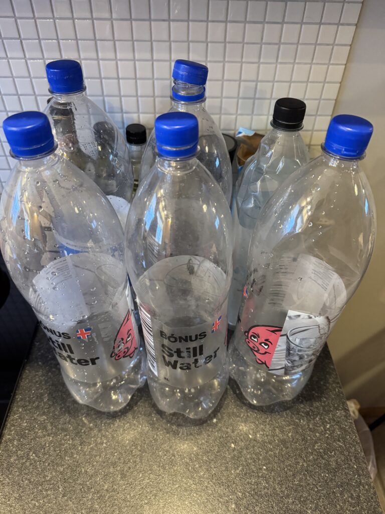 Side note: we wanted to take a photo to honor the immense importance of our frunk juice over the last 25 days. Each morning, we have filled these six 2-liter bottles with water to take on our journeys. We have frequently been in nature where there was no chance to fill our water bottles for hours so these have been a lifeline to keep hydrated and energized. Even though France, Spain, and Portugal (our next destinations) will likely have more access to water fountains or something similar, this frunk juice experience has shown us the benefits of having something so important as hydration under your own control. We don’t have to worry if there will be a water fountain and don’t have to deal with being cranky and dehydrated if there isn’t. As with all of Neverland, an ounce (or ton, in many cases) of preparation equals a world of fun and enjoyment for our day, avoiding common pitfalls. Anyway, we returned the car with the frunk (and don’t plan on getting another Tesla) and are not taking these empty bottles on the plane with us, so we will have to recreate frunk juice experience in continental Europe. Fare the well, frunk juice bottles…you have been an amazing part of our Icelandic journey!